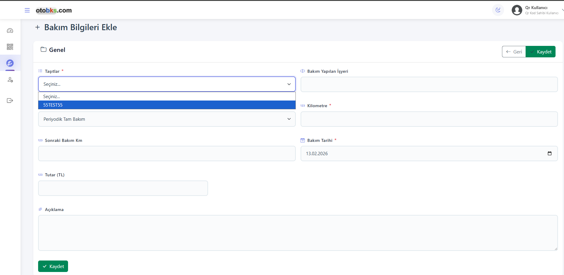 - QR Kod: Her araç için özel QR kod